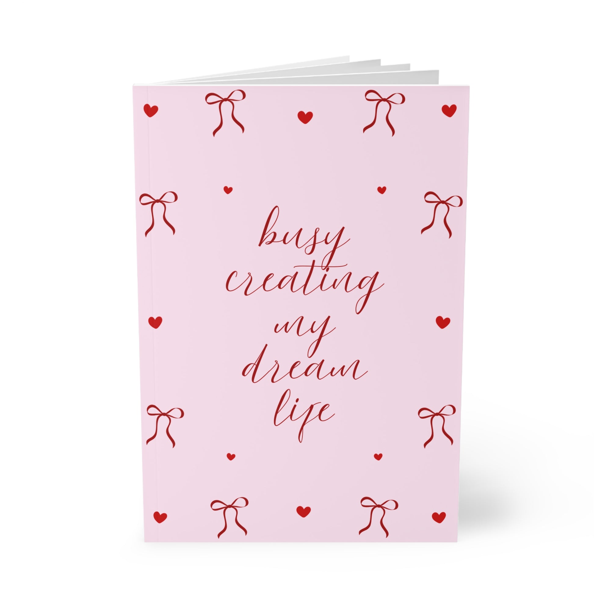 Let your dreams take center stage with this Busy Creating My Dream Life Notebook – the perfect A5 companion for visionaries, journal lovers, and go-getters. Featuring a soft pink cover sprinkled with delicate red bows and hearts, this A5 notebook for dreamers blends feminine charm and motivational flair in true coquette style.