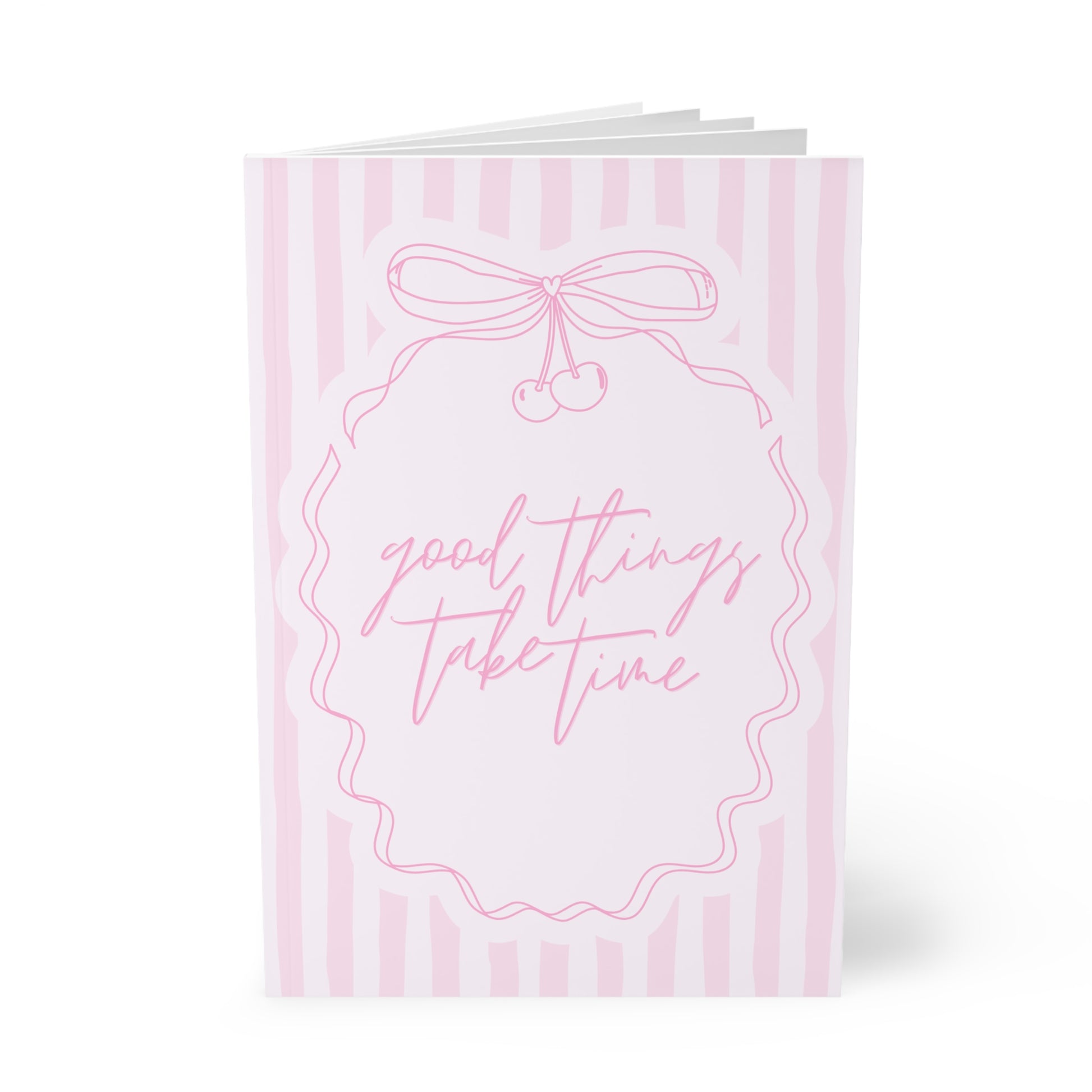 Slow down, breathe, and let your thoughts flow. The Good Things Take Time Notebook is a gentle reminder to trust the process—beautifully designed with soft pink stripes, delicate details, and an elegant handwritten quote on the cover. Perfect for journaling, planning, note-taking, or creative writing, this A5 softcover notebook is lightweight and easy to carry wherever inspiration strikes.
