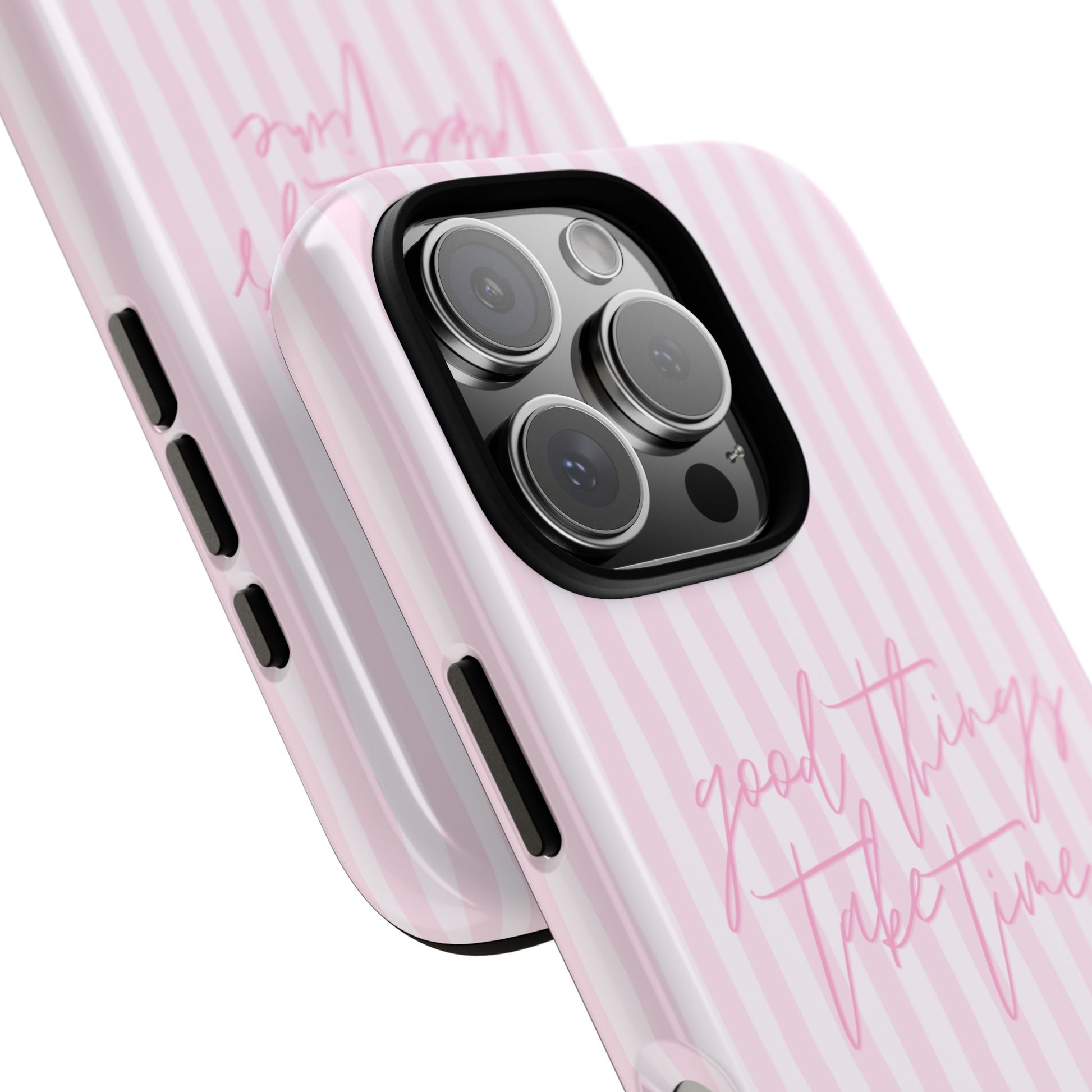 Carry a gentle reminder with you everywhere you go. The Good Things Take Time Phone Case features a soft pink striped design with an elegant handwritten quote, blending protection with positivity in the most aesthetic way.